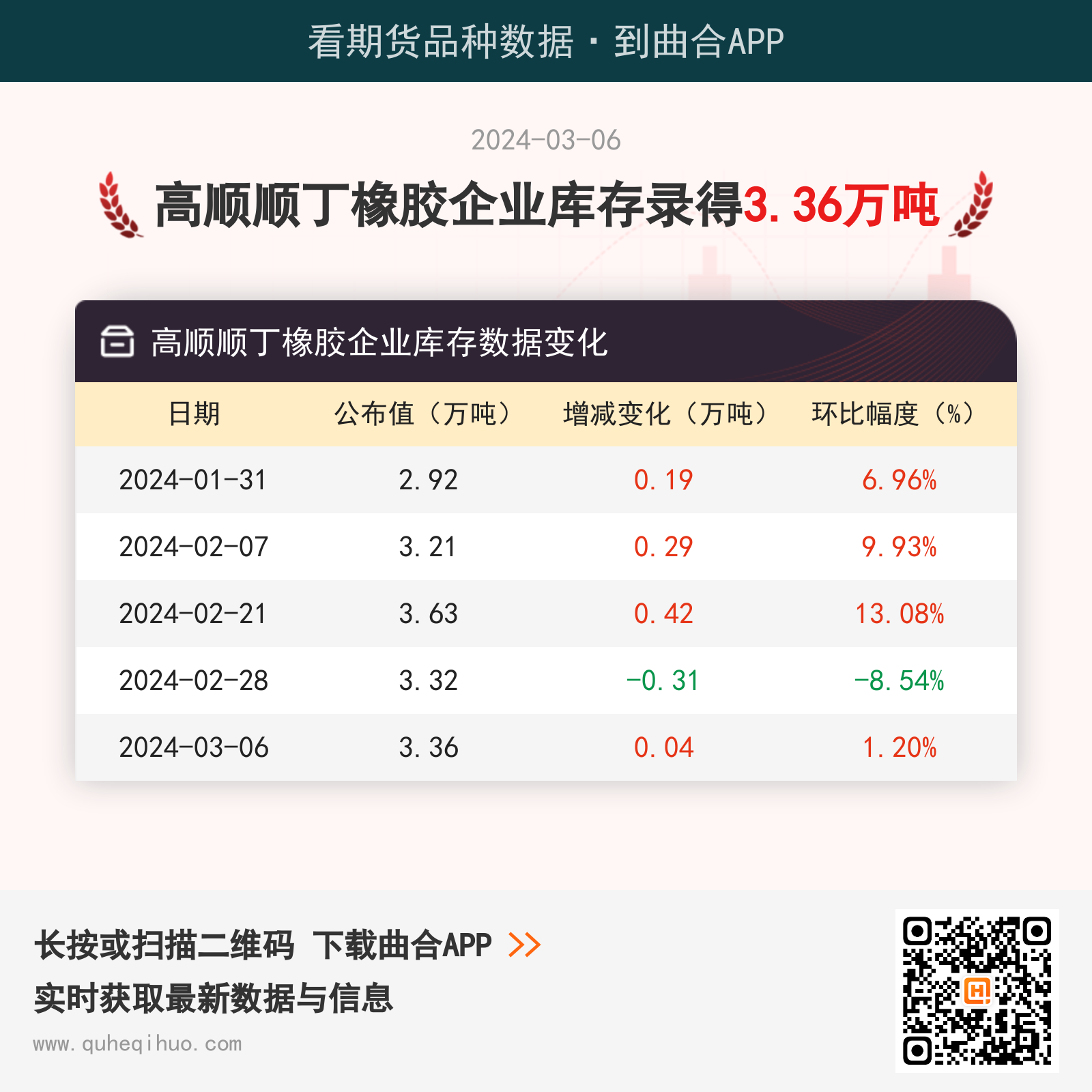 截止3月6日,高顺顺丁橡胶企业库存数据为 3.36万吨,较上一周增加0.04万吨,环比涨幅1.20%。图片来源于网络,如有侵权,请联系删除 近期高顺顺丁橡胶企业库存数据变化如下: 合成橡胶期货实时行情 更新时间:---- 最新价 -- 涨跌值 -- 涨跌幅 -- 点击查看合成橡胶最新行情走势